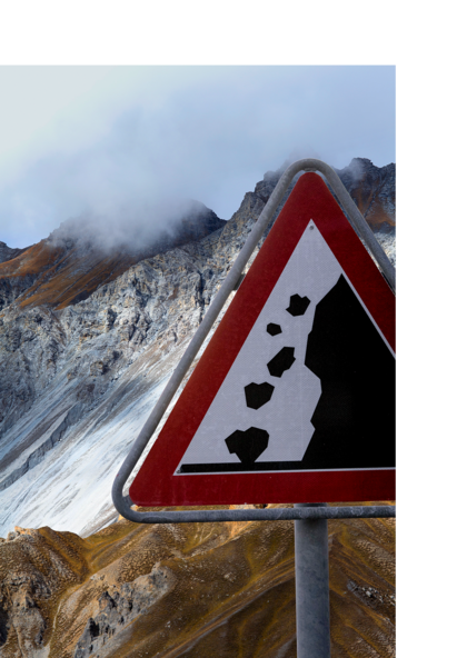Steinschlag-Warnschild in den Schweizer Alpen. Foto Keystone (Val dal Botsch), Bildmontage Joseph Haas