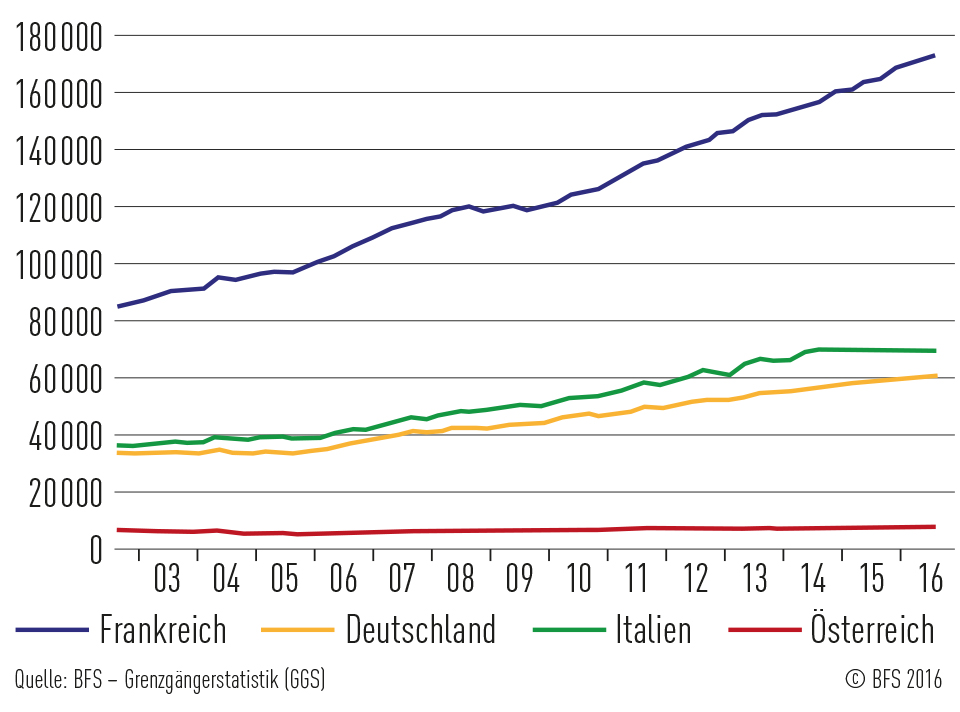 Im Jahr 2001, also vor Inkrafttreten der Personenfreizügigkeit mit den westlichen EU-Staaten, zählte das Bundesamt für Statistik (BfS) 151 133 Grenzgänger in der Schweiz. Inzwischen sind es 314 110 Personen (Stand: 3. Quartal 2016). Die meisten von ihnen kommen aus Frankreich und arbeiteten vor allem in der Genferseeregion. Keine andere Grossregion der Schweiz beschäftigt mehr Grenzgänger. An zweiter Stelle kommt die Nordwestschweiz mit der Polstadt Basel. Dort sind 72 556 Grenzgängerinnen und Grenzgänger tätig, überwiegend aus Deutschland, aber auch aus Frankreich. Die meisten italienischen Grenzgänger pendeln wiederum in den Kanton Tessin, weitere nach Graubünden oder ins Wallis. In Bezug auf die Gesamtzahl beschäftigter Grenzgänger steht das kleine Tessin nach dem Genferseebogen und der Nordwestschweiz an dritter Stelle. In Bezug auf den Anteil an allen Erwerbstätigen machen die Grenzgänger in der Genferseeregion nur gut 10 Prozent aus, in der Nordwestschweiz ist ihr Anteil ähnlich hoch. Eindeutig am höchsten ist der Anteil im Tessin, wo 26,2 Prozent aller Erwerbstätigen Grenzgänger sind.