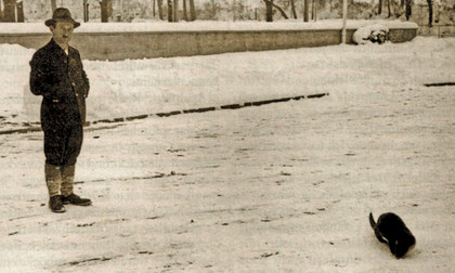 Wärter Schindelholz auf einem winterlichen Spaziergang mit Peterli, fotografiert von Tierparkverwalter Heini Hediger. Foto Heini Hediger, 1938/39