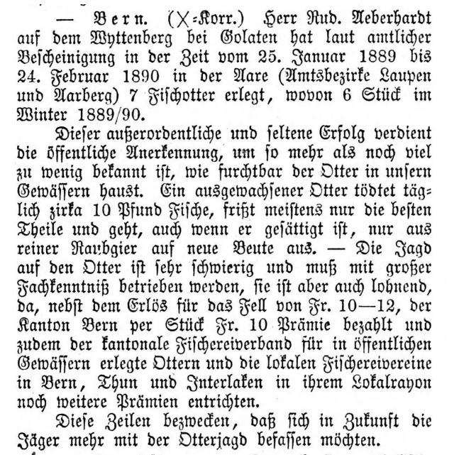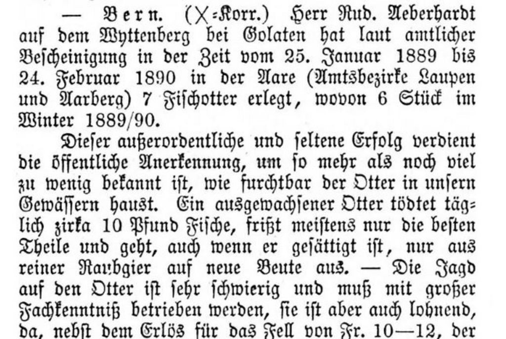 1953 wandte sich der Basler Zoodirektor Heini Hediger an den Bundesrat. In seinem Aufsatz «Fischotter und Bundesräte» bedankte sich der profilierte Zoologe für das damals in Kraft gesetzte revidierte Jagdgesetz. Es markierte eine Wende: Endlich wurde der Fischotter mit anderen Tierarten wie der Lerche oder dem Steinadler von der Liste der jagdbaren Tiere gestrichen und unter Schutz gestellt. Für den Fischotter kam der Schutz sehr spät, denn er war zu diesem Zeitpunkt so gut wie ausgerottet.