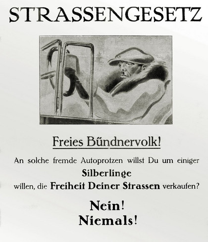 «Willst du, Bündnervolk, auf deinen Strassen Frondienst leisten für die, die dann in hochmütiger Verachtung in ihren Kraftwagen an dir vorbeisausen?» In klassenkämpferischem Ton drückten die Autokritiker auf öffentlichen Plakaten leidenschaftlich aufs Gaspedal. Im Automobil, dessen erstes Exemplar Carl Benz 1886 in Deutschland patentieren liess, sahen sie 20 Jahre später einen «Stinkkarren» und ein «Modespielzeug», vor allem aber ein «Protzfahrzeug». Die Mehrbesseren aus der Stadt würden die hart arbeitende Bauernschaft in den weitläufigen Tälern Graubündens in Staub- und Abgaswolken versinken lassen, wenn man nicht dagegen vorgehe.