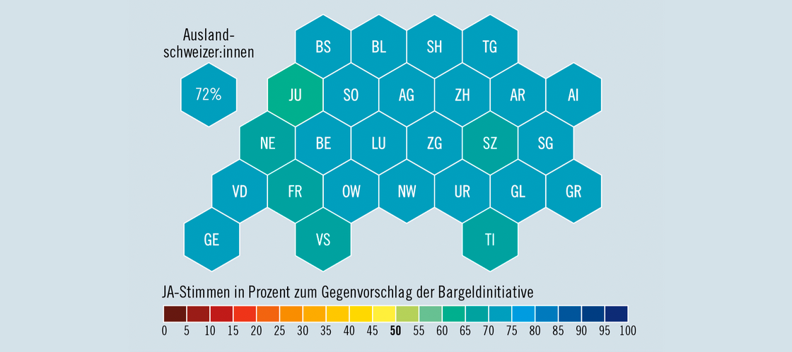 Der Schutz des Bargeldes («Revue» 5/2025) steht neu in der Verfassung – aber nicht so, wie es eine Initiative forderte: Diese scheiterte an der Urne. Stattdessen fand der moderatere Gegenvorschlag von Regierung und Parlament breite Zustimmung, wie die Karte zeigt: 73,4 Prozent sagten Ja, minim weniger in der Diaspora.