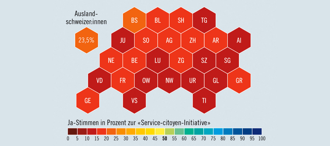 Eine schmerzvolle Niederlage gab es am Abstimmungssonntag auch für die Urheberinnen und Urheber der Initiative «Für eine engagierte Schweiz». Sie wollten die Militärdienstpflicht breiter definieren und als gemeinnützigen «Service citoyen» auf alle Schweizer Bürgerinnen und Bürger ausdehnen («Revue» 4/2025: «Service citoyen» | Schweiz stimmt über einen Bürgerdienst für alle ab). Davon wollte das Stimmvolk aber explizit nichts wissen: Es lehnte die Initiative mit 84,1 Prozent Nein ab. Auch die Stimmenden der Fünften Schweiz sprachen sich mit 76,5 Prozent Nein sehr deutlich gegen die Idee aus.