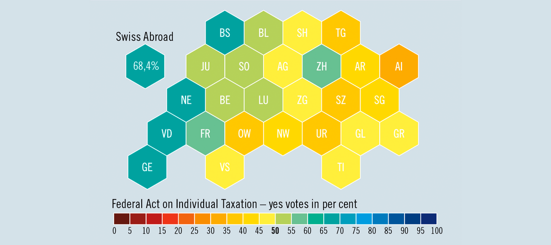The electorate approved a change in tax law, with 54.3 per cent voting yes. Every person will now be taxed individually, regardless of their marital status. The expatriate yes was even more emphatic. This marks the end of the so-called “marriage penalty” – which some cantons had wanted to maintain by calling a referendum in the first place. The Confederation and cantons must implement the reform by 2032.