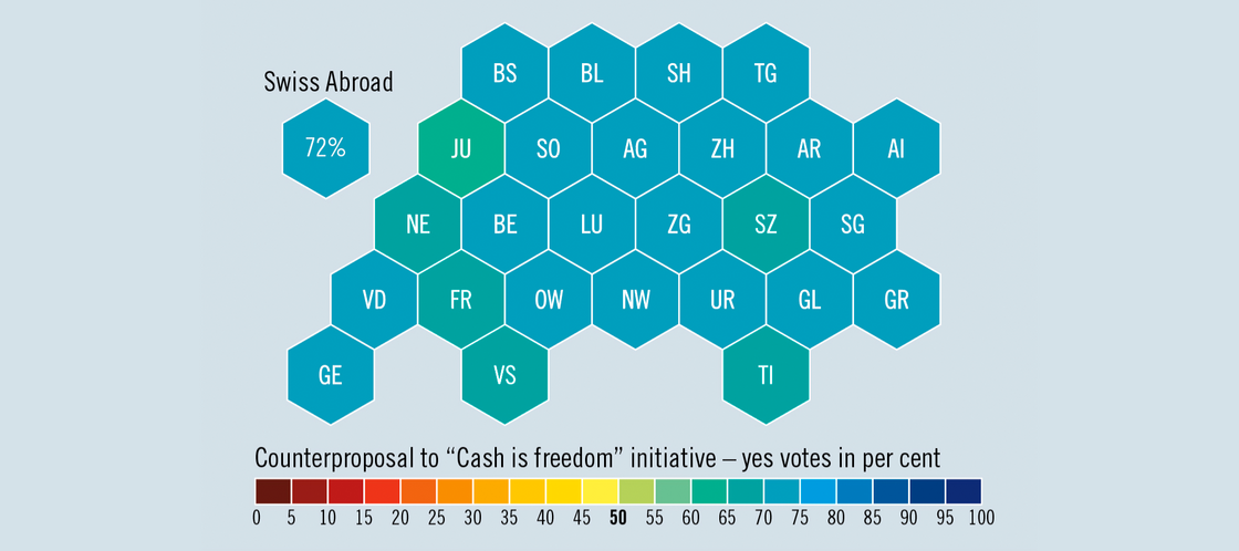 Cash (see “Swiss Review” 5/2025) is now enshrined in the constitution, but not to the extent proposed by the “Cash is freedom” initiative, which was rejected. The more moderate counterproposal by the Federal Council and parliament attracted wide support, as the map shows. Some 73.4 per cent were in favour; the percentage of yes votes in the “Fifth Switzerland” was slightly lower.