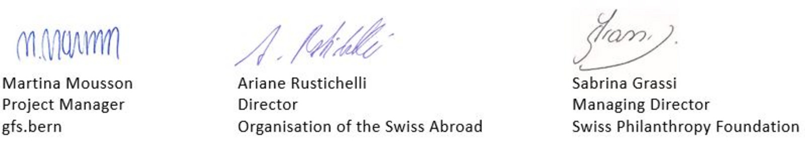If you have any questions about the study, please contact Annick Doriot, gfs.bern's project manager, at annick.doriot@gfsbern.ch. The survey will be published on the channels of the Organisation of the Swiss Abroad (SwissCommunity - www.swisscommunity.org) and the Swiss Philanthropy Foundation (www.swissphilanthropy.ch) by the end of August.