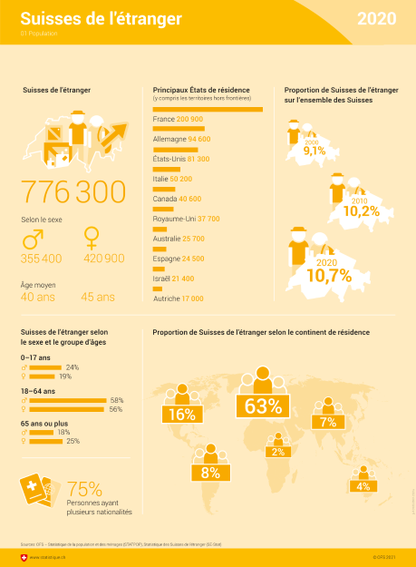 Fin 2020, près d'un Suisse sur onze vivait à l'étranger selon l’Office fédérale de la statistique. Par rapport à 2019, cette proportion a augmenté de 0,7 %. La progression s'observe notamment dans le groupe des personnes de plus de 65 ans (+2,8%), tandis que la répartition des femmes (54%) et des hommes reste similaire par rapport à 2019. Dans l'ensemble, l'augmentation du nombre de Suisses de l'étranger est plus faible que les années précédentes (2018 : +1,1% et 2019 : +1,4%). La pandémie mondiale a très probablement obligé certains Suisses à remettre à plus tard leur projet de départ à l’étranger.