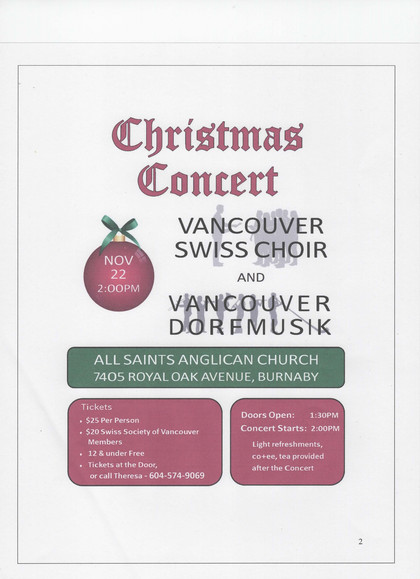 La culture chorale suisse s'exporte également à l'étranger... Voici une invitation du «Vancouver Swiss Choir» et de la «Vancouver Dorfmusik» à un concert de Noël en décembre 2025. Photo MAD