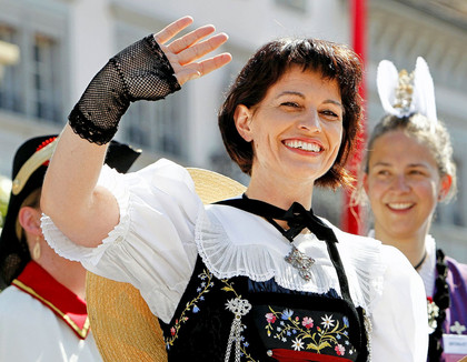 L’ancienne présidente de la Confédération, Doris Leuthard, dans son costume argovien à l’occasion de la fête fédérale des costumes suisses en 2010. Photo Keystone
