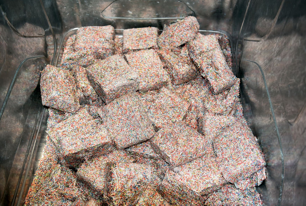 Les pièces en bon état, quant à elles, sont emballées dans des rouleaux de papier qui sont empilés dans des caisses. Une couleur est attribuée à chaque type de pièces; pour les 20 centimes, il s’agit du rouge. Là aussi, la plupart des étapes de travail sont automatisées. Les tâches effectuées à la main sont l’ouverture des rouleaux de pièces livrés et l’examen des pièces qui ne peuvent pas être traitées par la machine. Au mur, une inscription lumineuse étonnante attire le regard: «Argent et valeur. Le dernier tabou». Cette décoration en lettres rouges rappelle l’exposition nationale Expo.02. À l’époque, la BNS avait chargé le curateur d’art Harald Szeemann (1933–2005) d’y réaliser un pavillon. La pièce maîtresse de l’exposition était une vitrine dans laquelle un bras robotisé enfournait méthodiquement des billets de 100 francs dans une déchiqueteuse. Ce geste provocateur de destruction de valeur était un leurre: il s’agissait de billets de banque en mauvais état, qui auraient de toute façon été détruits – comme cela se fait tous les jours dans la cave de la BNS, à l’abri des regards.
