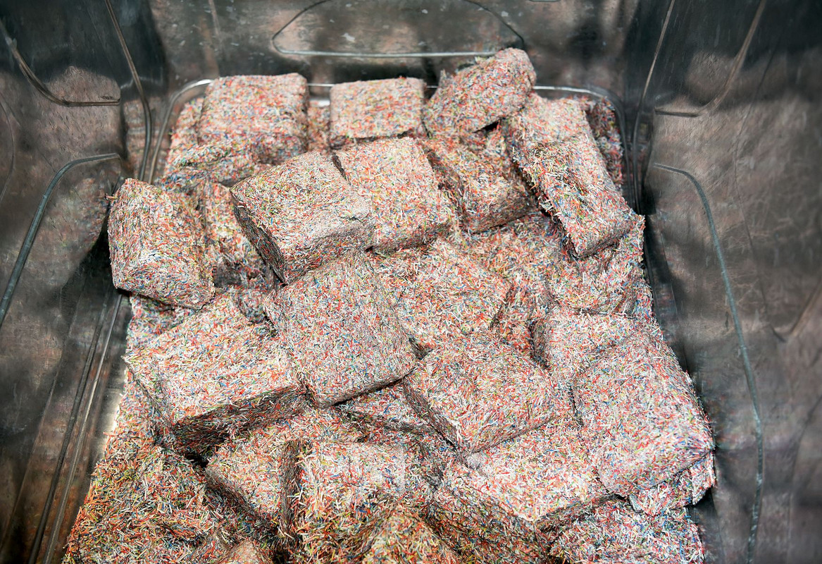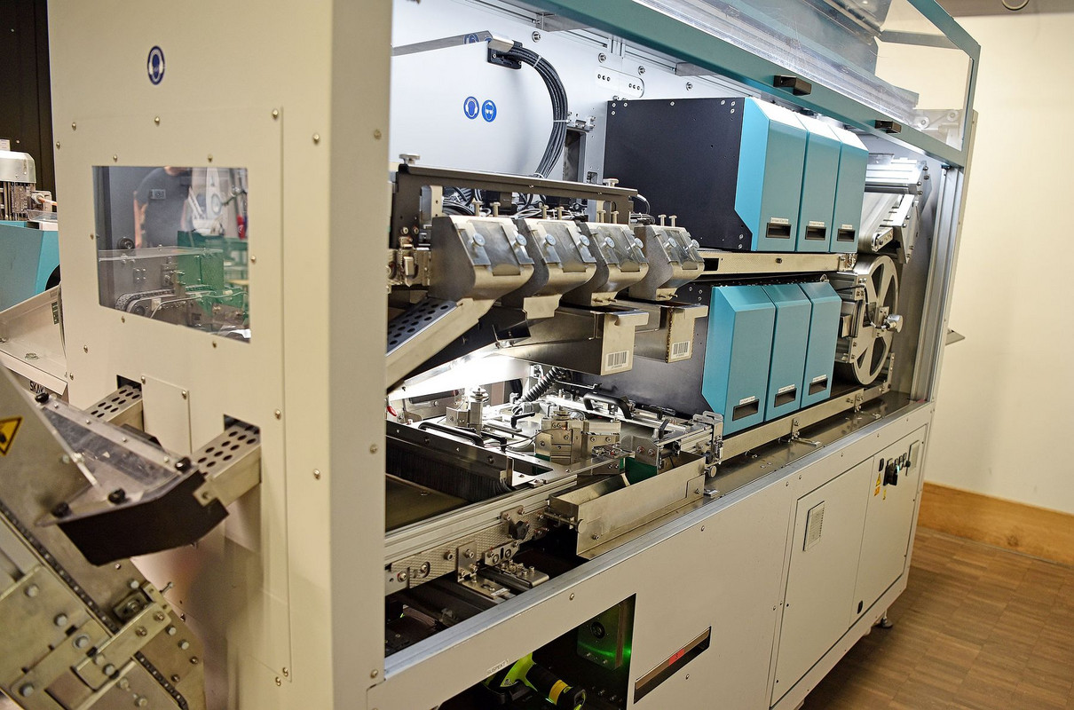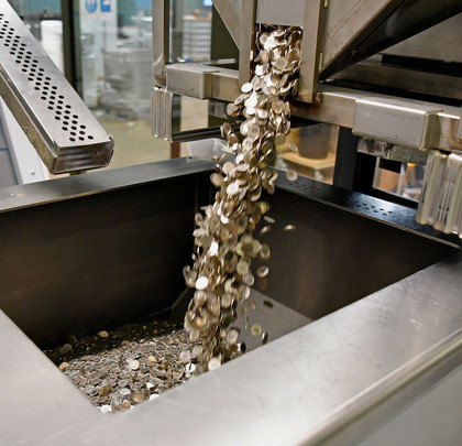 L’ascenseur nous emmène ensuite plus bas, au niveau du traitement des pièces, qui s’avère bien plus bruyant que celui des billets. Aujourd’hui, ce sont des pièces de 20 centimes qui crépitent dans la trieuse. Celles en mauvais état atterrissent directement dans un bac séparé, avant d’être réexpédiées à leur fabricante, Swissmint. La Monnaie fédérale les rend méconnaissables et élimine le métal.