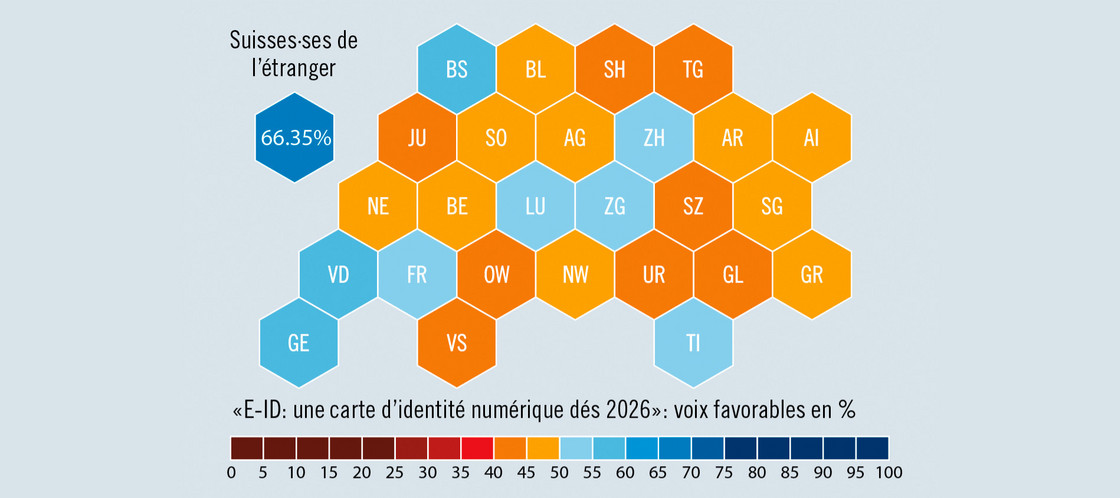 La partie a été serrée, comme elle l’est rarement en Suisse: le 28 septembre 2025, seuls 50,34 % des votants se sont prononcés en faveur de l’introduction d’une identité électronique (e-ID). Les Suisses de l’étranger ont été particulièrement nombreux à la plébisciter, puisque pas moins de 63,93 % d’entre eux ont voté en faveur de la loi fédérale sur l’identité électronique (voir aussi «Revue Suisse» 3/25). Sans ces voix de l’étranger, le résultat aurait été encore plus serré: le projet n’aurait été accepté qu’à 50,14 %.